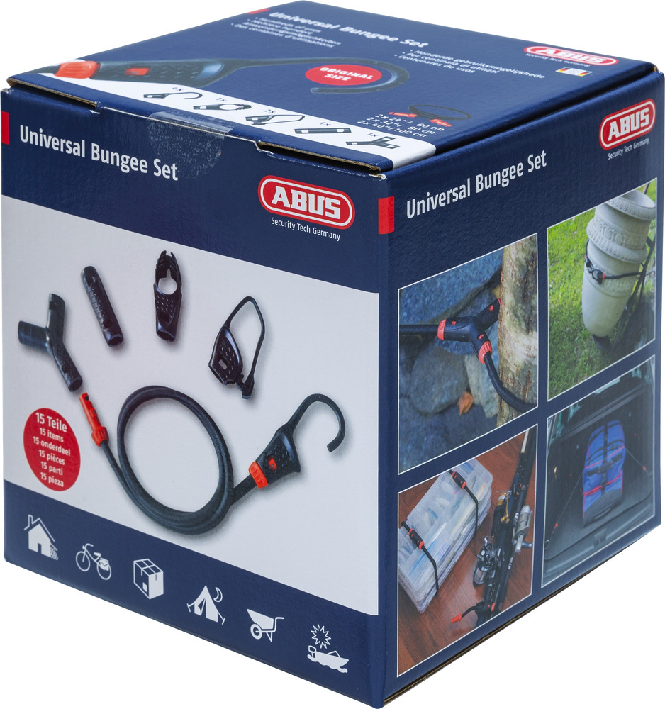 Met de universele snelbinderset van ABUS beveiligd en fixeert u voorwerpen in huis, in de tuin, in de auto, op de fiets of op de motor. De 15-delige set bestaat uit 6 elastische snelbinders, 6 haken, 2 verlengstukken en 1 doorvoer-hulpstuk. Hierdoor kunt u zelf de snelbinder samenstellen en verlengen.