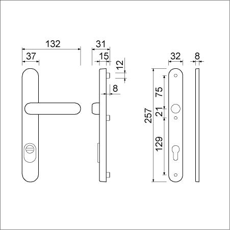 Buitenschild 15 mm dik en 37 mm breed met deurkruk 353 vastdraaibaar, binnenschild 8 mm dik 32 mm breed met deurkruk 379 ROTA verend vastdraaibaar, vierkantstift 8 mm en 3 schroeven M6 RVS.