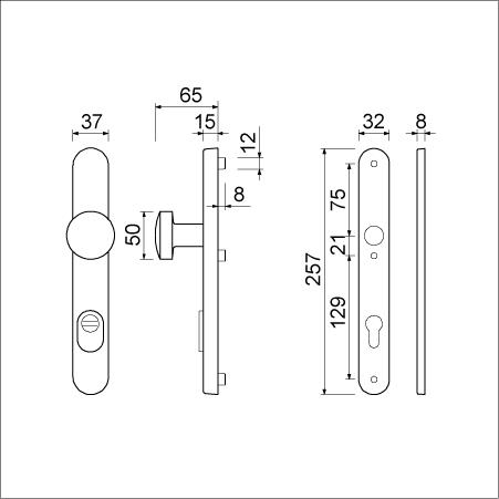 Buitenschild 15 mm dik en 37 mm breed met knop 169/50 vast, binnenschild 8 mm dik en 32 mm breed met deurkruk 378 ROTA verend vastdraaibaar,