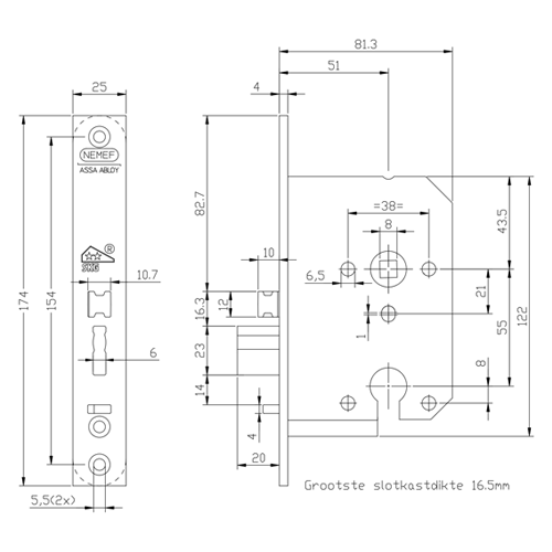 | Afmetingen voorplaat (in mm): | 174 x 25 |