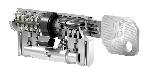 EPS is een geveerd stiftsysteem met 5 of 6 actieve, geveerde controle-elementen en biedt maximaal 20 extra zijdelingse coderingen. De geïntegreerde manipulatiebeveiliging van de sleutel in de cilinder en de dubbele werking van de blokkeerstiften zorgen voor een goede beveiliging. De cilinder is verkrijgbaar in compact en modulair systeem.