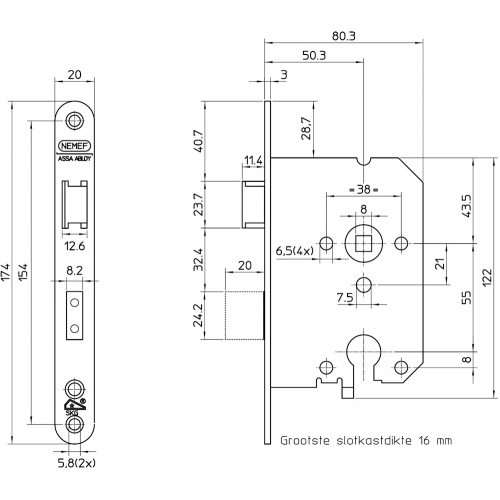 | Afmetingen voorplaat (in mm): | 174 x 20 |